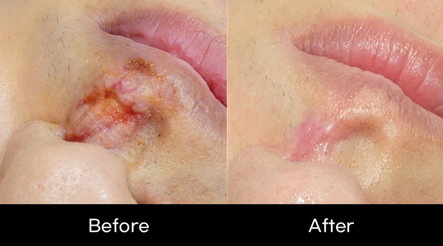 병변 부위: 안면부 (코/인중 주변) 깊은 패임 및 홍반을 동반한 흉터